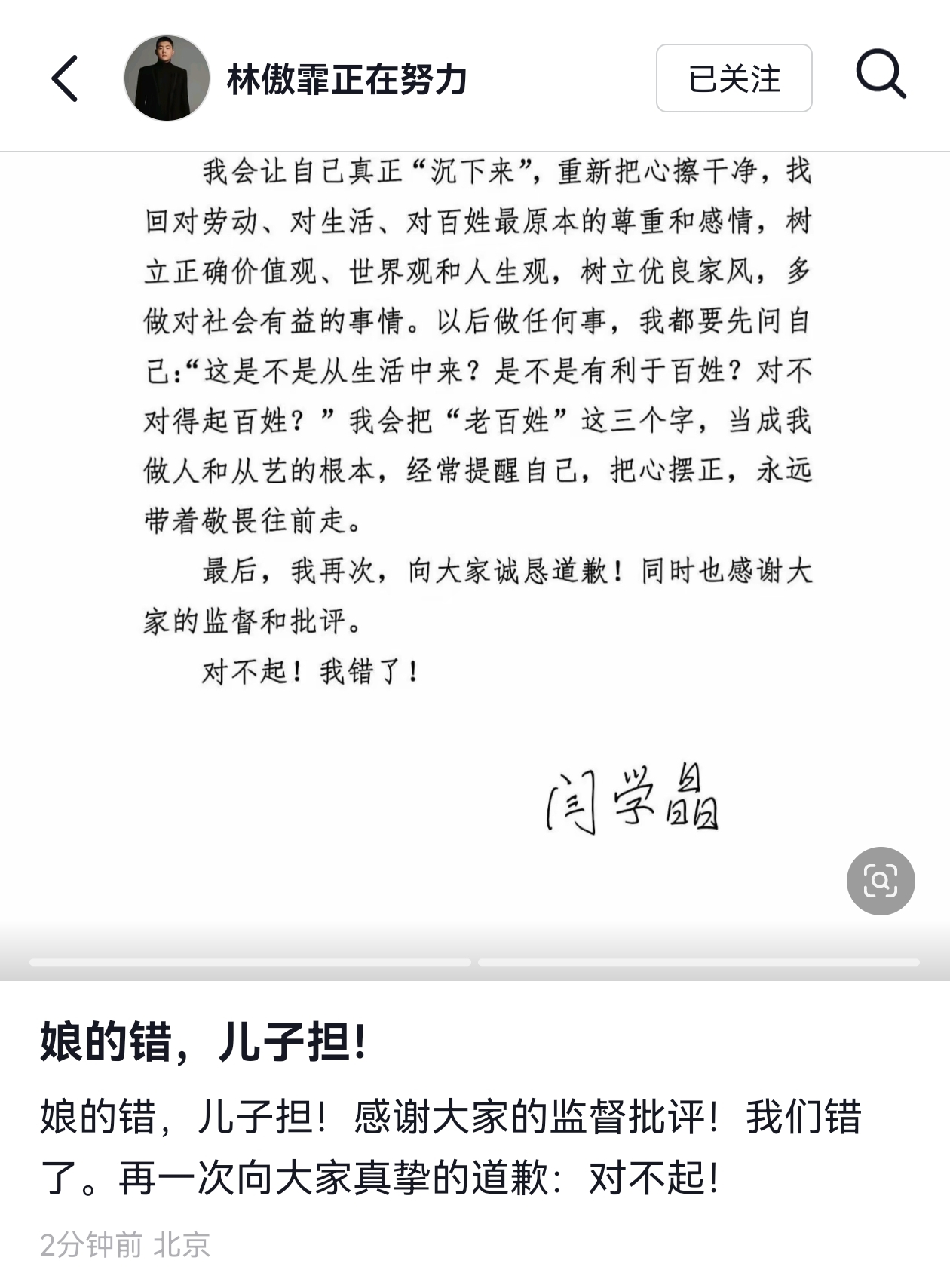 先是她在社交账号发了一条几千字的道歉文案,接下来她的儿子又主动为母亲承担错误。