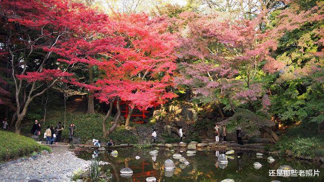 东京的赏枫季节通常从11月中旬持续到12月上旬,新宿御苑是观赏红叶的绝佳地点之一。这座融合了日式庭园、法式几何庭园和英式风景庭园的大型公园,在秋天化身为色彩斑斓的调色盘。园内种植了约65种、1300棵树木,包括银杏、枫树、榉树等,层层叠叠的红黄交织,倒映在平静的池水中,构成一幅动人的画卷。最佳观赏期一般在11月下旬,游客可以坐在草坪上野餐,感受落叶飘舞的浪漫。