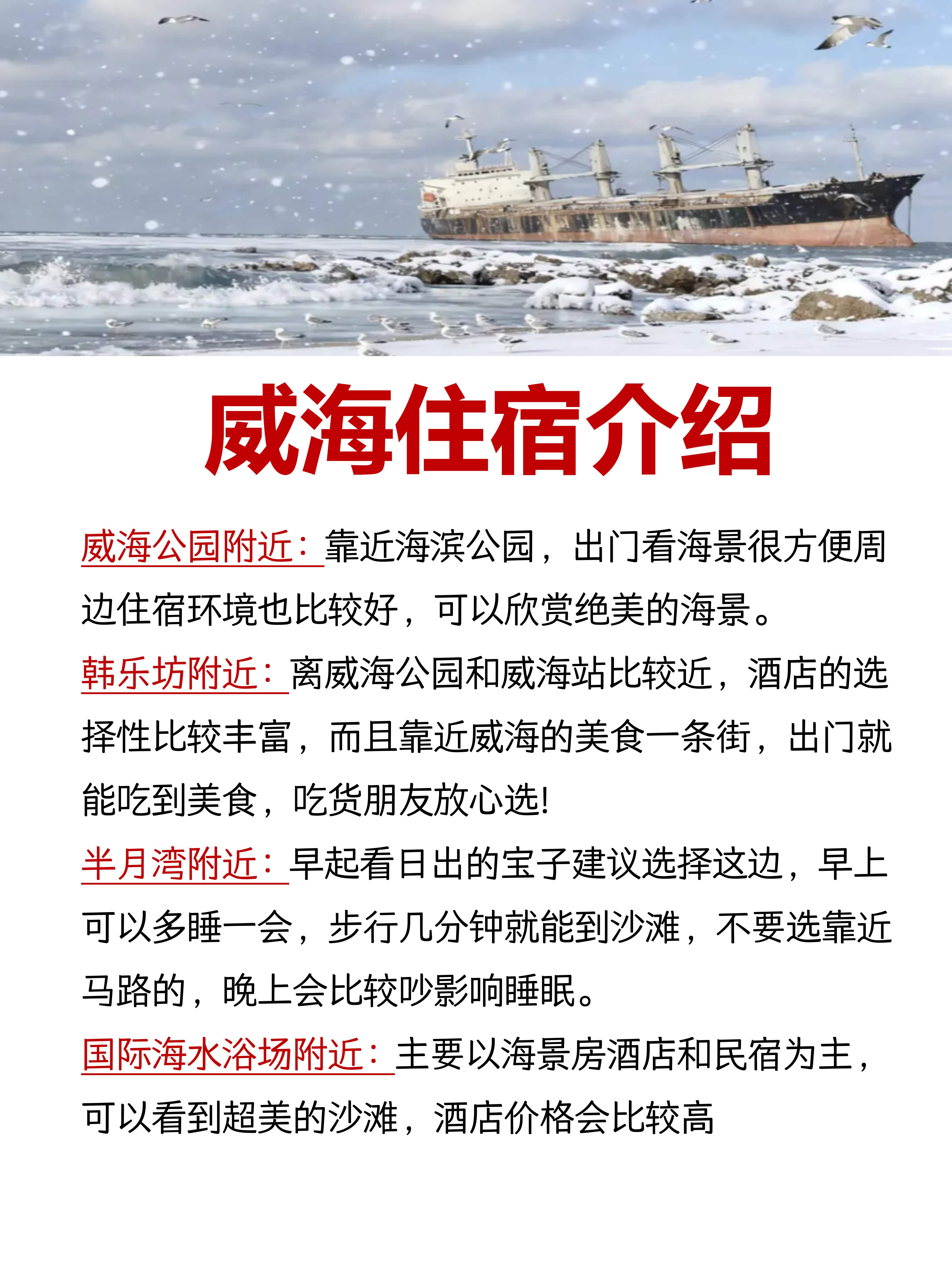 📍韩乐坊附近:离威海公园和威海站比较近,酒店的选择性比较丰富,而且靠近威海的美食一条街,出门就能吃到美食,吃货朋友放心选!📍半月湾附近:早起看日出的宝子建议选择这边,早上可以多睡一会,步行几分钟就能到沙滩,不要选靠近马路的,晚上会比较吵影响睡眠。