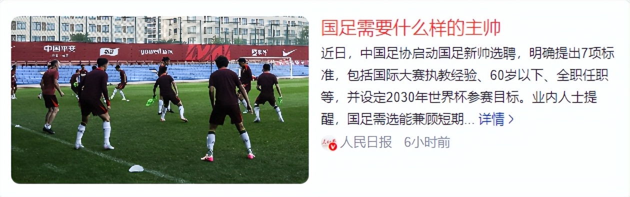 同时,人民日报也表示:国足近23年来平均每任主教练的执教时间仅1.6年,单届最长任期不足3年,远低于亚洲乃至世界足坛强队主帅平均5年以上的执教周期。然而,国足频繁换帅的背后,却是球队遭遇连续6届世预赛出局的尴尬,凸显出中国足球人才基础薄弱与国家队体系建设缺失的顽疾。