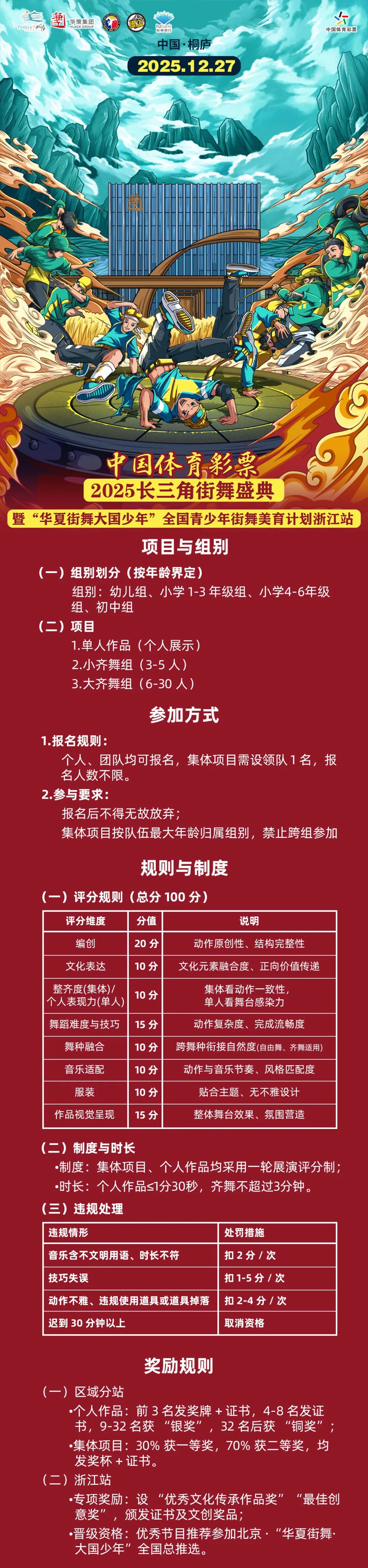 明天见!中国体育彩票2025长三角街舞盛典暨华夏街舞·大国少年全国青少年街舞美育计划浙江站交通住宿旅游指南汇总
