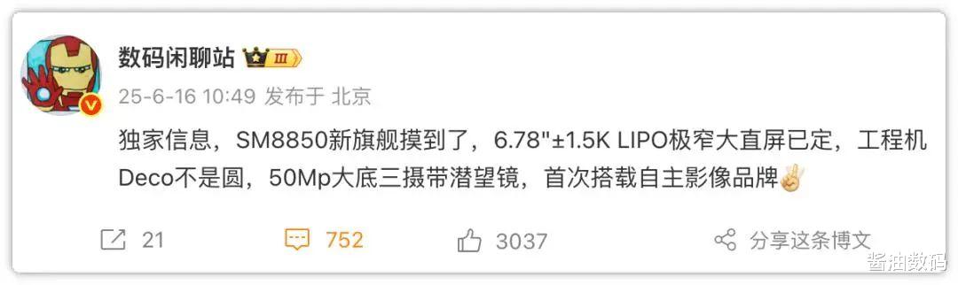 近期知名爆料博主数码闲聊站爆料:“SM8850新旗舰摸到了,6.78英寸1.5K LIPO极窄大直屏已定,工程机相机模组不是圆,5000万像素大底三摄带潜望镜,首次搭载自主影像品牌!”