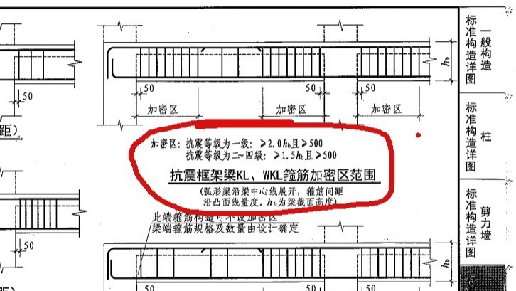其中一个监理指着一个框架梁的箍筋说加密区不够,那是截面200X500的梁,意思是宽度200mm高度500mm,按照钢筋图集,箍筋加密区为1.5h也就是,750mm。