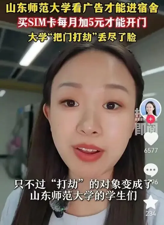 另一面是山东师范大学,学生回宿舍得先看15秒广告,或每月交5元“包月费”。学校说:“为了安全,不是广告。”