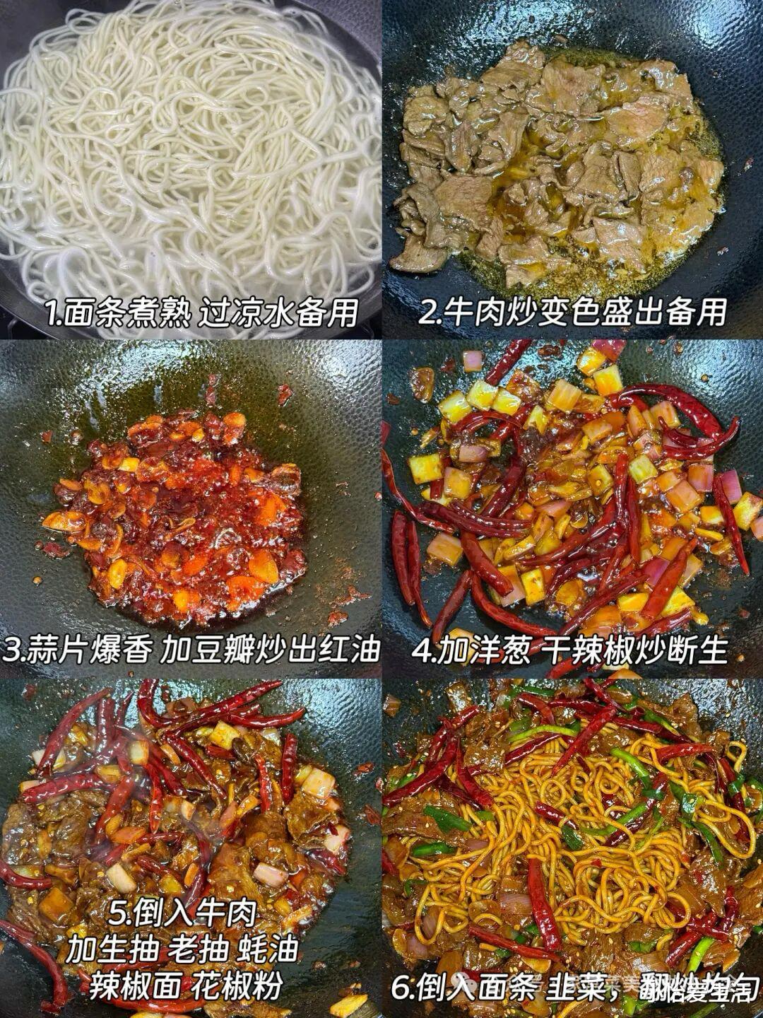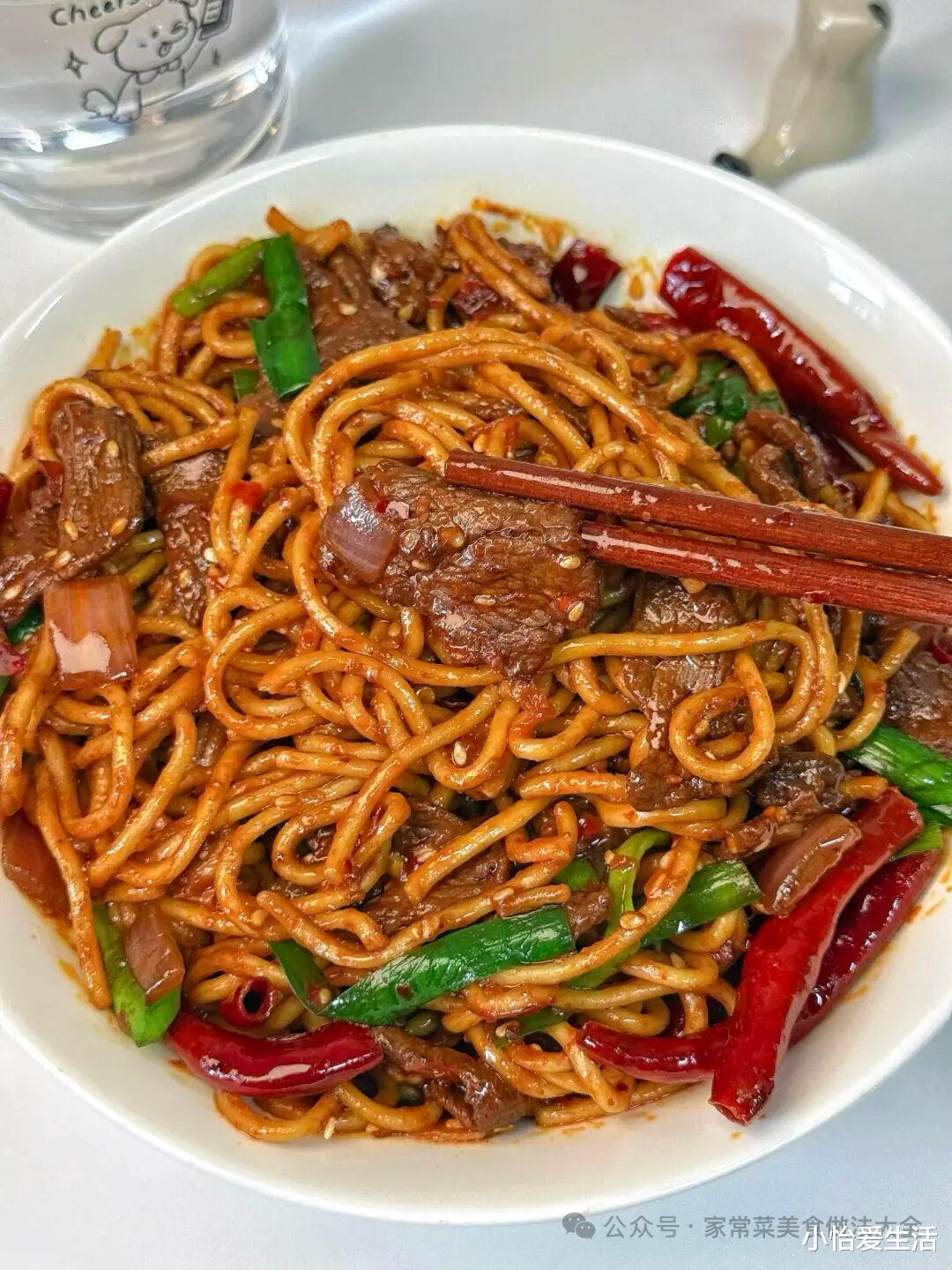 。据说当年食堂大师傅下班晚,剩一把拉面、一把包菜,干脆生炒,结果油香蹿出校门,学生排队翻墙。家庭复制不用甩面,超市买粗鲜面,煮八成熟,过冷水拌少许油,根根分明。热锅冷油,下羊肉片(或牛肉)炒散,加洋葱丝、青红椒、包菜,大火翻到有焦边,把面散进去,沿锅边淋两勺生抽、一勺老抽、半勺孜然粉,用筷子挑着炒,让酱油遇见高温腾起烟雾,面被染成酱油色,吸饱肉香。最后撒一把蒜末、一勺醋,再翻十下,焦香、孜然香、蒜香三层暴击,一根面都不舍得剩。