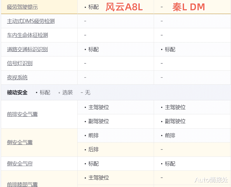 配置方面,两款车型还是有些差异化的,具体配置请参考上方的配置表,左侧为风云A8L,右侧为秦L DM。