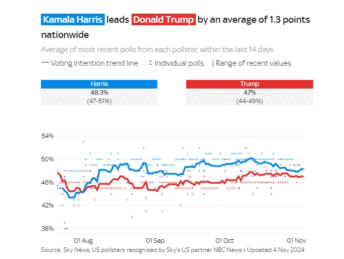 与此同时,最新民意调查显示,哈里斯在全国范围内以 48.3% 比 特朗普47%领先,优势缩小。