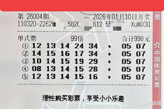 除了复式票,一张99倍投的单式票意外成为焦点。这张彩票合计投注990元,包含5组单式号码,每组后区均为05、07,前区则是连续的邻号组合,比如12、13、14、24、34,14、15、16、17、34等,这种集中选择连号的方式,展现了购彩者独特的选号偏好,99倍的投注倍数也让这张彩票的关注度大幅提升。