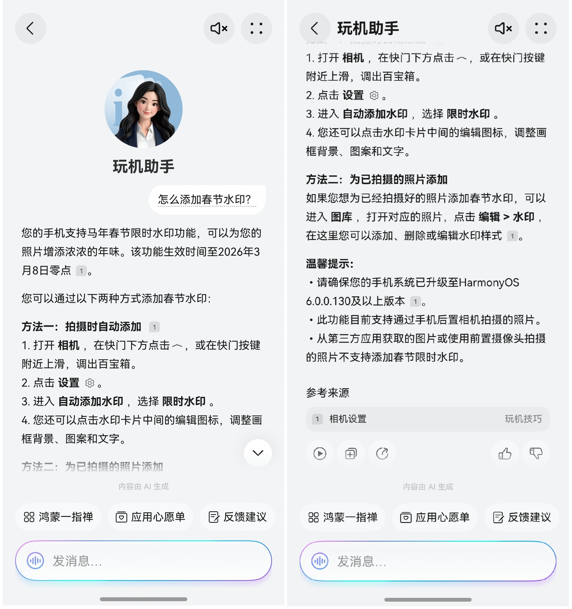 想给照片加春节水印,直接向玩机助手提问“怎么添加春节水印”,它会立即给出详细的操作指引,还贴心提示注意事项。