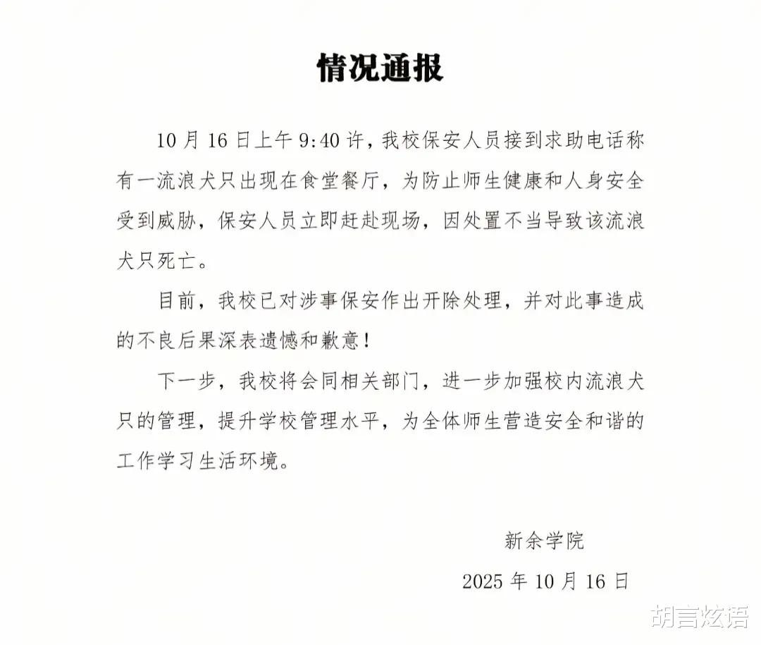 2025年10月16日上午9时40分左右,江西新余学院保安人员接到求助电话,得知有流浪犬只现身食堂餐厅。考虑到师生的健康与人身安全可能会受到威胁,保安人员不敢有丝毫懈怠,即刻赶赴现场进行处置。然而,令人惋惜的是,由于处置方式欠妥,最终导致该流浪犬只死亡。
