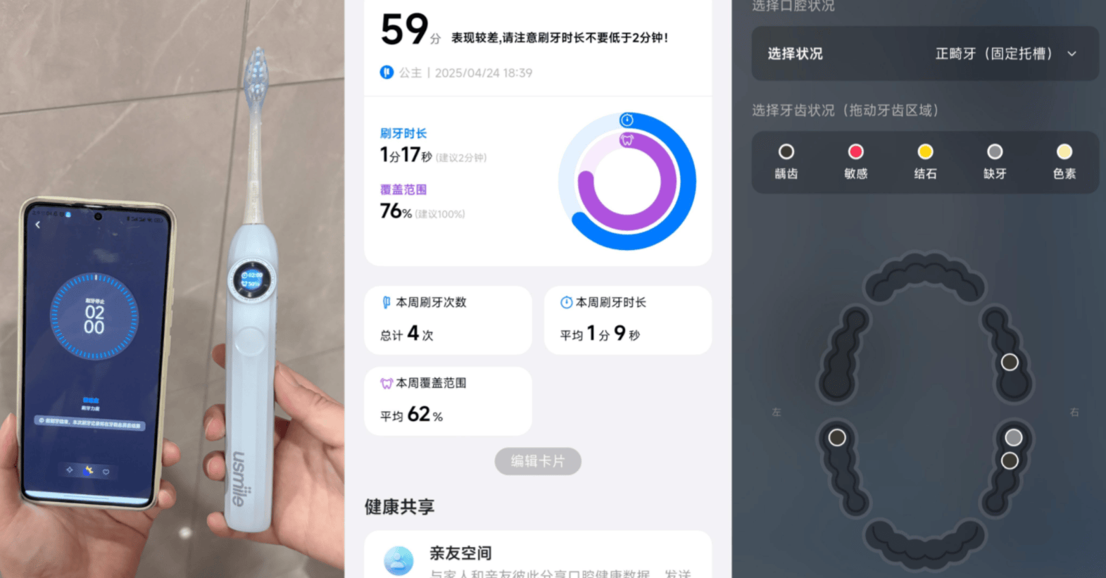 但笑容加Y30好就好在它APP可以录入牙齿情况,敏感、龋齿、缺牙都可以记录,会根据你的牙齿情况给你定制一个刷牙方案,而且它还会自动给你生成刷牙日报和周报。
