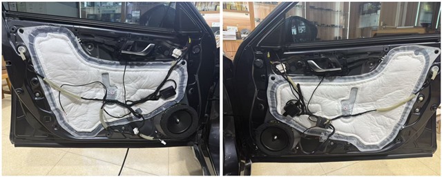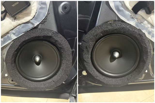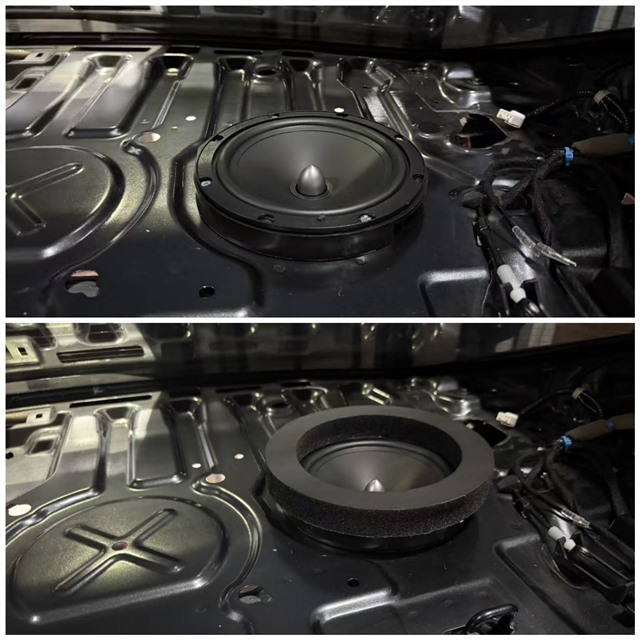 安装完高音后,为前门板原位无损安装了劲浪ASE-165的中低音喇叭。安装过程中,特别为每只喇叭加装了美音圈,能防止声音向四周扩散,使声音集中向前发出,达到更好效果,让车门形成一个理想的音箱腔体,提升中低频的力度和弹性。