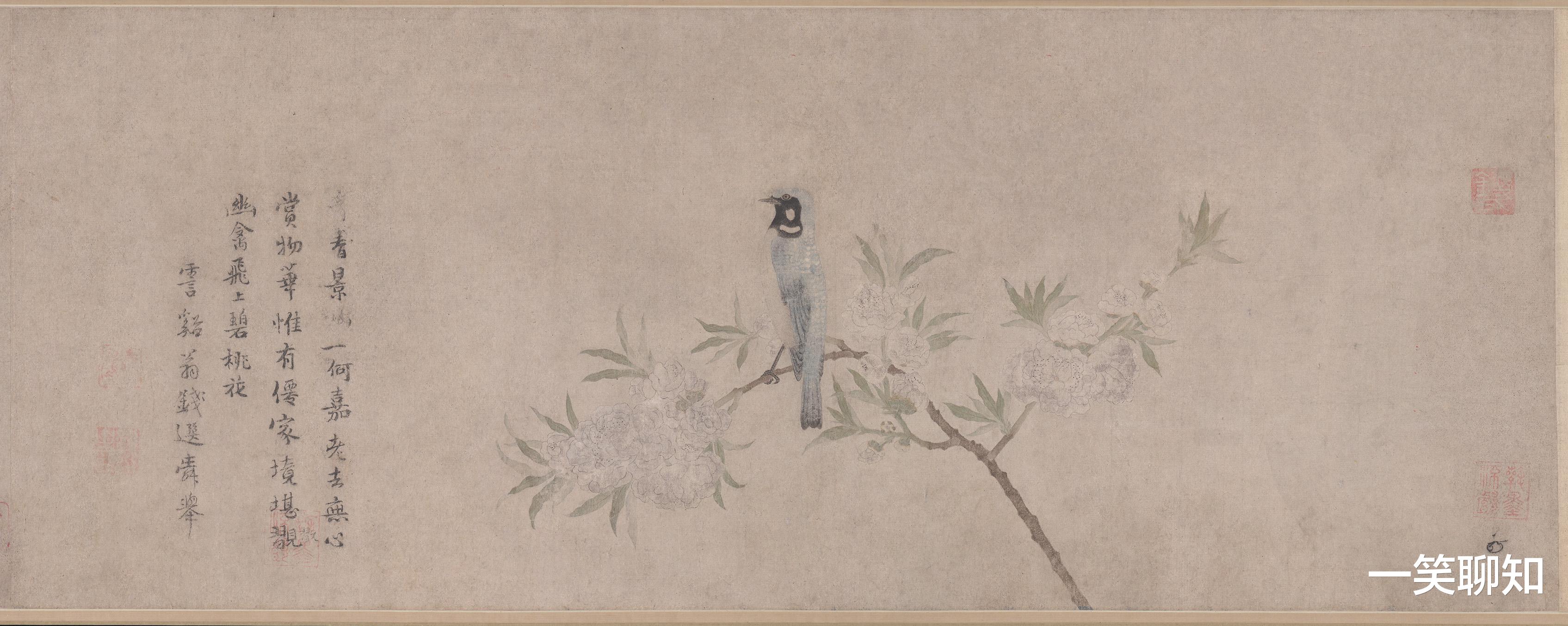 这朵被“虐待”的牡丹,其实藏着钱选的心事。《花鸟图》作于1294年,正是他隐居太湖的晚年,每段画都配有他的题诗,其中牡丹段写道:“头白相看春又残,折花聊助一时欢。”表面是叹春光易逝,实则是借残花暗喻故国凋零。