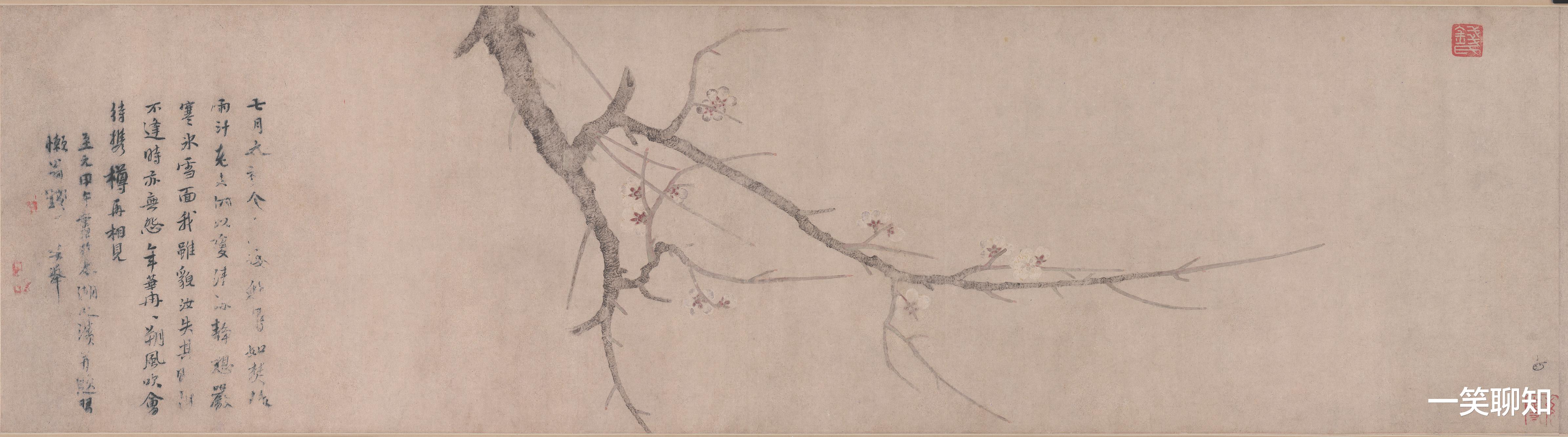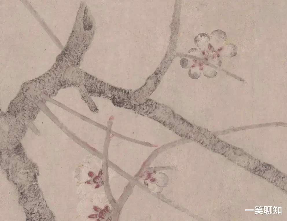 更绝的是他的笔法。牡丹枝干上的赭色线条故意偏离墨线,据说是因为他“手指颤掉”(可能是长期饮酒所致),但这种“失误”反而让枝干像被风吹得歪歪扭扭,仿佛在颤抖中坚持站立。梅花段更绝,不用墨线勾勒,直接用白粉没骨渲染,花瓣边缘泛着氧化的黑色,像被泪水浸透的纸,清冷孤傲得让人揪心。