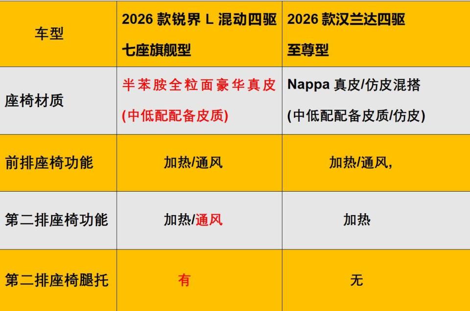 而拿中高配的26款汉兰达380T 四驱豪华版 7座(售价28.48万)来说,整车的前排座椅有通风加热功能,但是二排座椅就没有配备通风加热,这一点还是不太友好!即使是26款汉兰达四驱至尊型(指导价32.58万),第二排座椅也仅仅配备了加热功能,并没有通风、腿托等舒适配置。