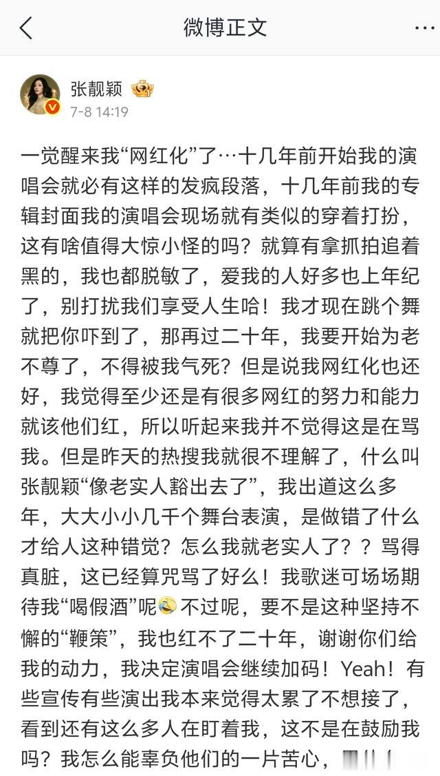 不曾想网友一句“像老实人豁出去了”,却惹怒了张靓颖本尊。她迅速在微博上发长文回应: