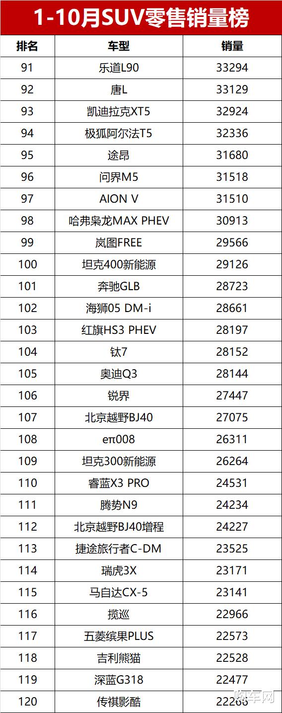 【2025年1-10月SUV零售销量排行榜 完整版】今年国内SUV市场继续保持快速增长的势头,乘联会数据显示,2025年1-10月我国SUV市场累计零售销量达到956.8万辆,同比增长9.1%,高于轿车市场的7.4%的同比涨幅。累计销量超过10万辆的SUV达到28款车型,传统燃油SUV依然在头部车型中占据主导地位,共有17款燃油车销量超过10万辆,而新能源车则只有11款车型销量突破10万辆大关。自主品牌在新能源领域占据绝对统治地位,除了特斯拉Model Y夺冠外,其他的10款新能源SUV全部属于自主品牌。传统燃油SUV则是合资品牌占优,自主品牌只有6款燃油车销量超10万辆,而合资品牌则有11款燃油SUV超过10万辆的销量。真惨!1-10月SUV销量榜!星越L亚军,RAV4第五,比亚迪跌出前三!
