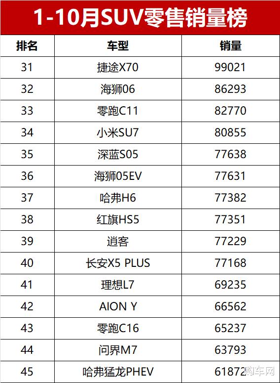 7月24日才正式上市的海狮06表现出色,截至10月底累计销量已经达到86293辆,排名第三十二位。6月26日正式上市的小米YU7累计销量也达到80855辆,排名第三十四位,并夺得10月份SUV销量冠军。