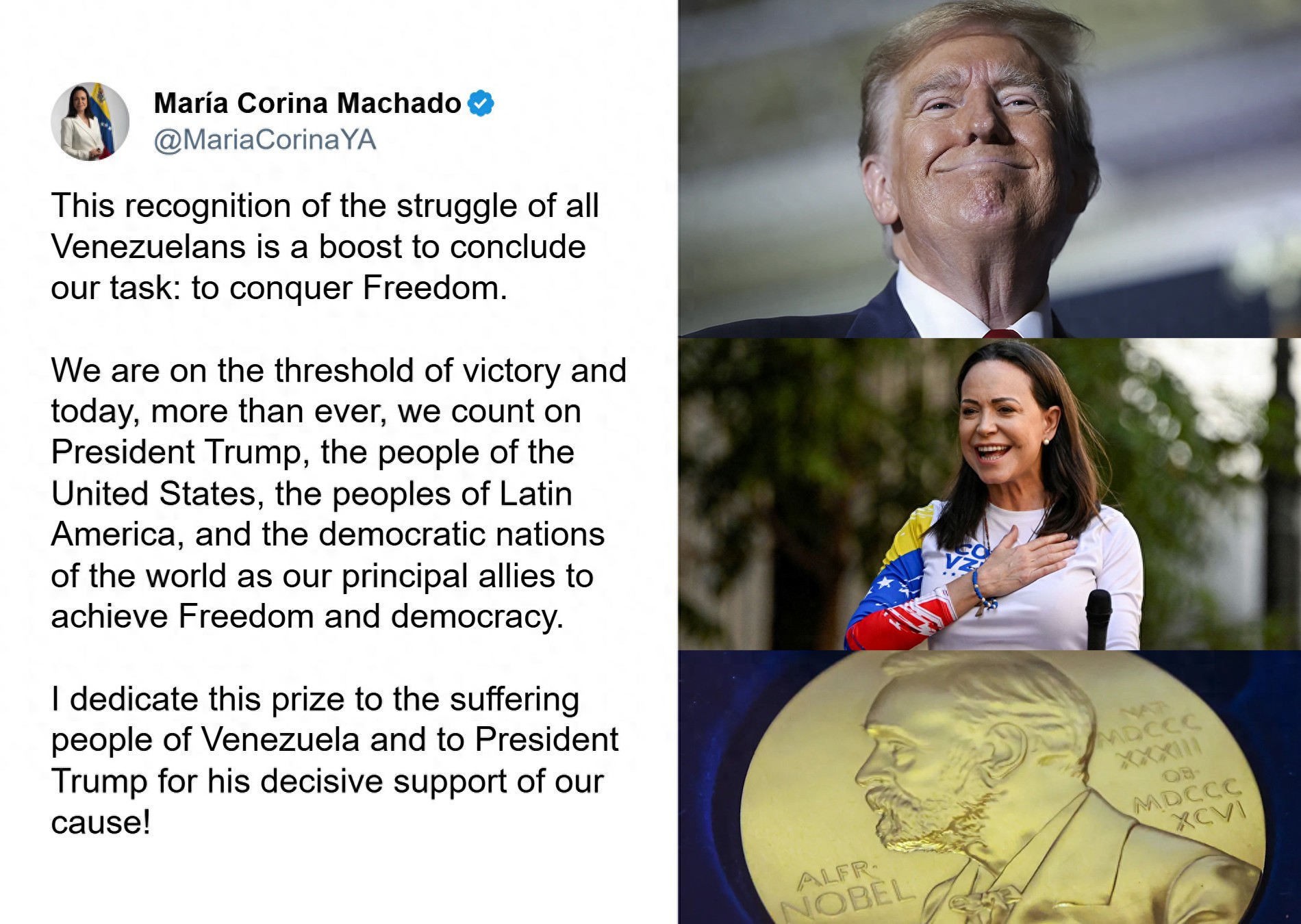 “我把这项荣誉献给委内瑞拉饱受苦难的人民,以及川普总统——他在我们的事业中给予了决定性的支持!”