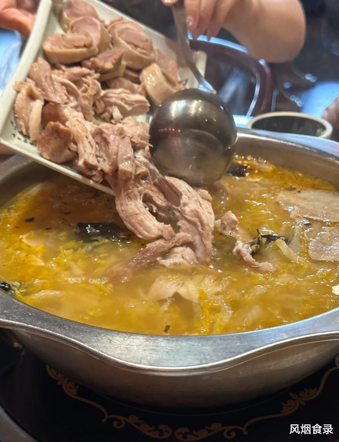 酸菜白肉锅汤清亮,酸得柔和,白肉薄如纸,蘸韭菜花“得劲儿”;
