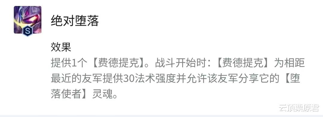 强度独一档的强化,送个稻草人不说,还能让距离最近的一个棋子拥有堕落使者的羁绊,开局还能提供30法强,无论是放在前排还是后排都是非常大的提升,本身稻草人的功能性就很强,拿到这个强化核心C位就等于多了两件装备,而且适配任何阵容,毕竟在云顶,什么棋子都有法强加成。