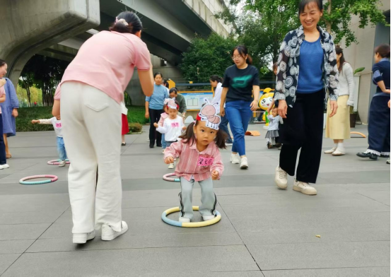 紧接着的“欢乐跳圈圈”环节,则彻底点燃了孩子们的活力。五彩的圆圈像一朵朵盛开的小花散落在地,孩子们听着指令,像一只只快乐的小袋鼠,在圈圈之间蹦呀、跳呀,银铃般的笑声在空中回荡。