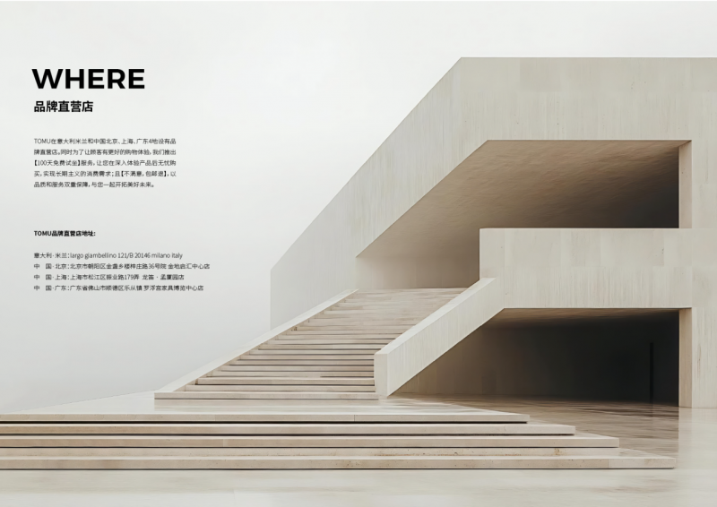 全球网络:米兰、北京、上海、广东的四城共鸣TOMU的直营店选址精准地体现了其品牌定位:意大利米兰——位于家居艺术之都的根源,彰显其纯正的意大利血统与设计前沿地位。中国北京、上海、广东——深度布局中国经济与时尚的核心腹地,精准触达对其品牌价值感共鸣最深的高净值人群和专业用户。这四家店构成了一个全球化的体验网络,共同向世界传递TOMU “意大利匠心,全球坐享” 的品牌理念。