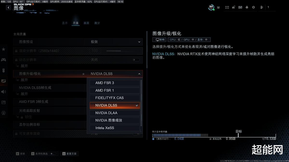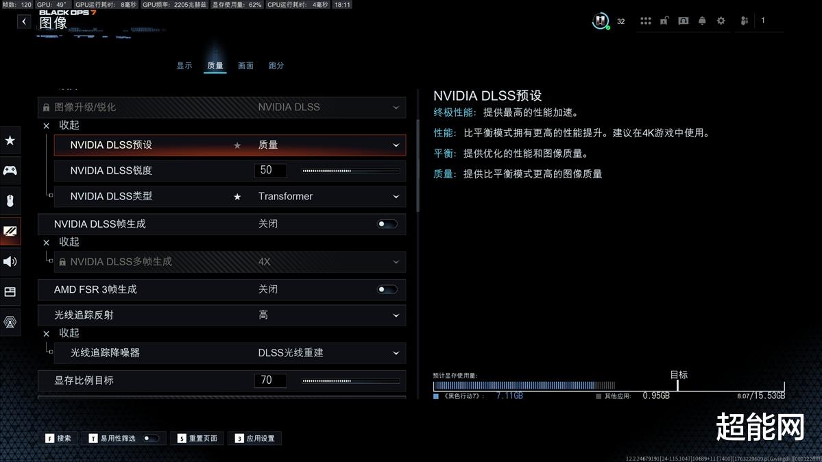 本作的画面设置菜单虽然是一如既往的难用,但是就功能的齐全度和可调节选项的详细度这两点还是非常优秀的。在超分辨率和帧生成方案上,《黑色行动7》一口气为我们带来了DLSS 4、FSR 4、FSR 3、XeSS等多种选择,甚至还有FSR 1这种初代的技术,只为了尽可能地提高兼容性,这点值得表扬。另外,它还提供了两种DLSS超分辨率模型可选,真的相当细心了。