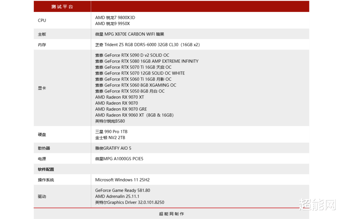 本次的测试平台还是那套锐龙7 9800X3D和X870E主板构成的平台,另外加一颗锐龙7 9700X用于CPU部分的测试。这次的GeForce RTX 50系列显卡全部来自索泰,包括最高级的索泰RTX 5090 D v2 SOLID OC和入门级的索泰RTX 5050 8GB 月白OC等,其中的很多显卡我们都评测过,大家可以通过搜索功能找到它们对应的评测内容。