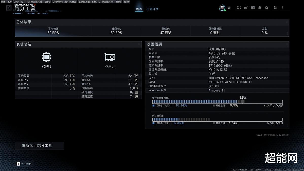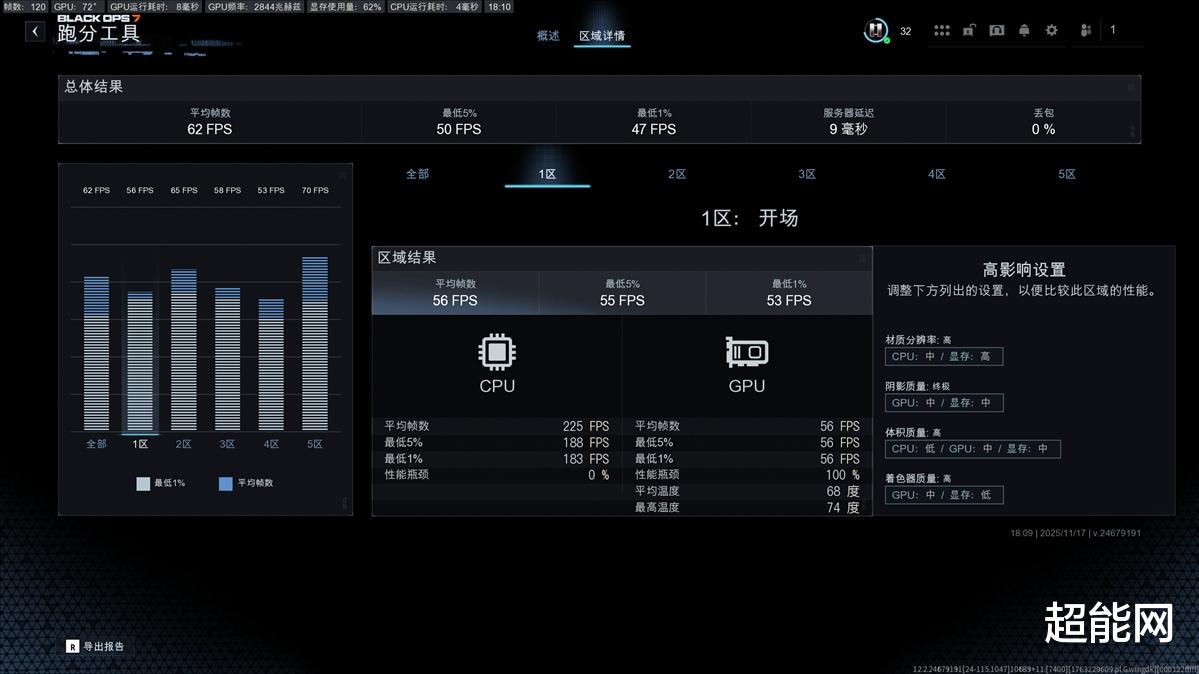 和前作一样,《黑色行动7》拥有一个非常好的跑分工具:它的数据记录非常详细,看帧率这块就知道了,有总体、CPU和GPU三个部分,能帮你快速找到配置的瓶颈在哪。区域详情则展示了战斗、潜水、爆炸等不同场景下的帧率,可以帮助玩家进一步细调画面设置。因此我们也没必要折腾太多,直接看这个跑分工具的数据就完事了。然后,考虑到绝大部分玩家不会在这种快节奏的多人游戏中开启光线追踪,因此下面的显卡需求测试环节里面我们将不会讨论光追时的情况。