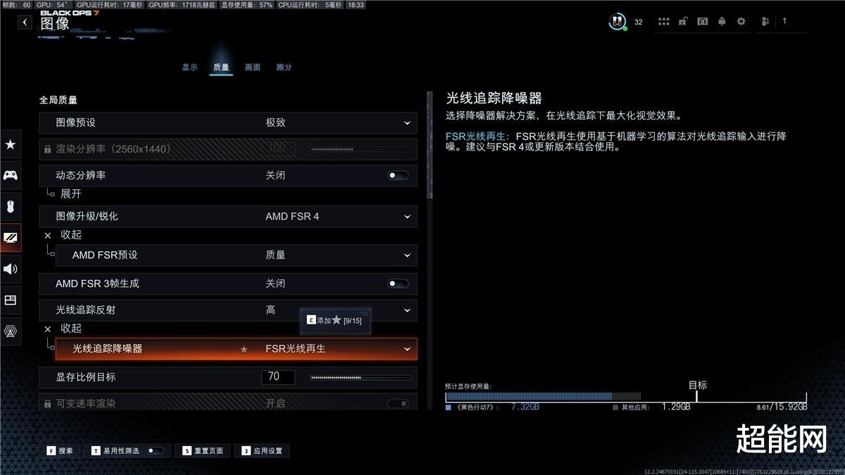哇,居然有光线追踪!由于《使命召唤》到现在已经是一个以多人对战为重心的游戏,因此光线追踪对于它来说其实意义没那么大,也许实际游玩中99%的玩家不会去想“要是能光线追踪会怎么样”这种问题。不过话虽如此,但T组还是很令人意外地为游戏提供了光线追踪反射选项,而且会在多人游戏和丧尸模式中生效。而光线追踪降噪器这一块,T组更是给了秘密惊喜——除了默认的降噪器和已经被广泛应用的DLSS光线重建之外,还有一个名为“FSR光线再生”的选项,这是以前没见过的。