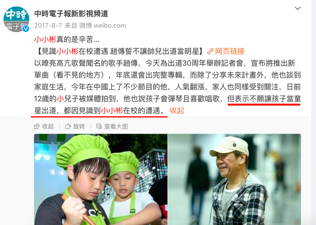 到了17年左右,哥哥(13岁)在学校被欺负的事情,是被圈里人知道了。记者去采访赵传问愿不愿意孩子当童星出道,赵传就表示不要,因为知道了小小彬在学校的遭遇。