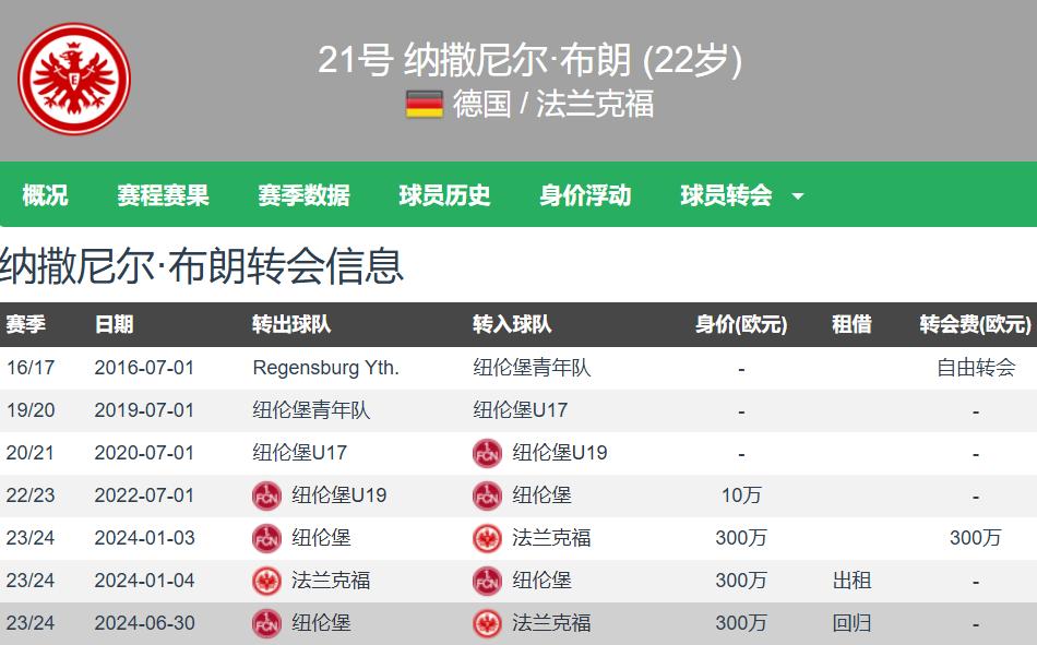 现年22岁的N-布朗,身高1.80,左脚球员,主打左后卫位置,也可以踢左中场,德转估价3000万欧元,现有合同至2030年。N-布朗本赛季至今各项赛事共为法兰克福出场18次,其中15次首发,合计出场1436分钟,贡献1球3助。