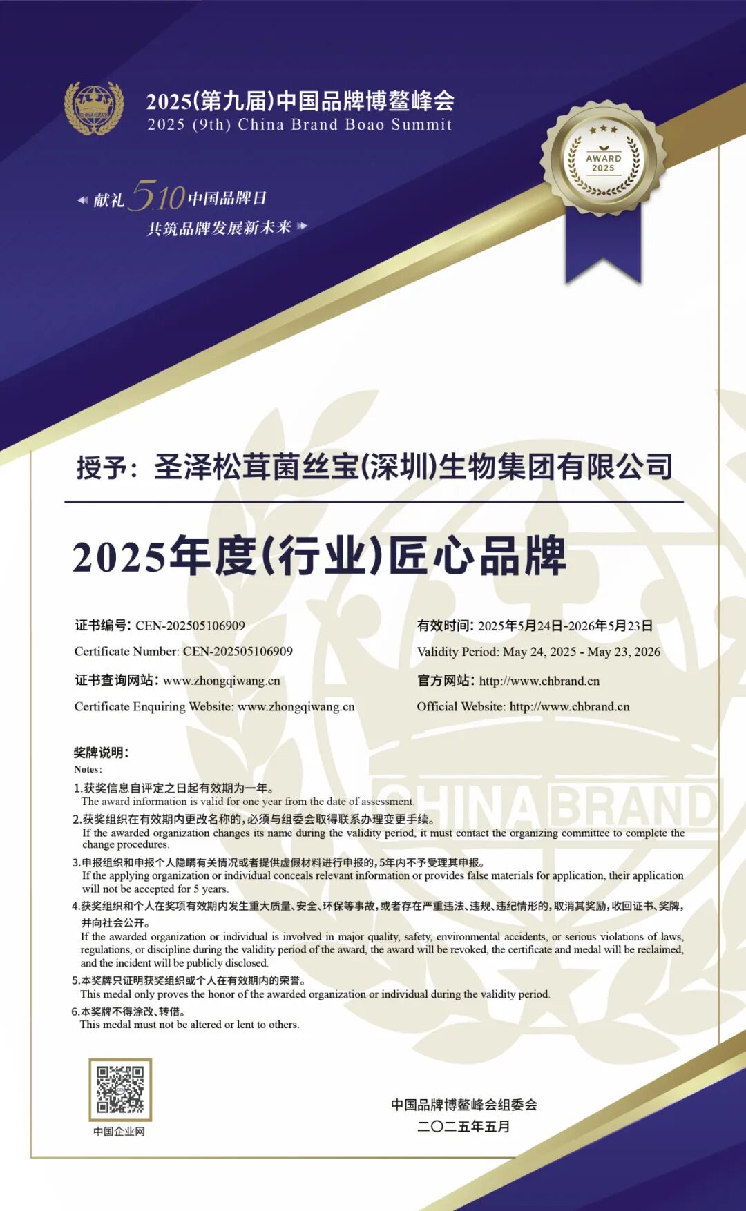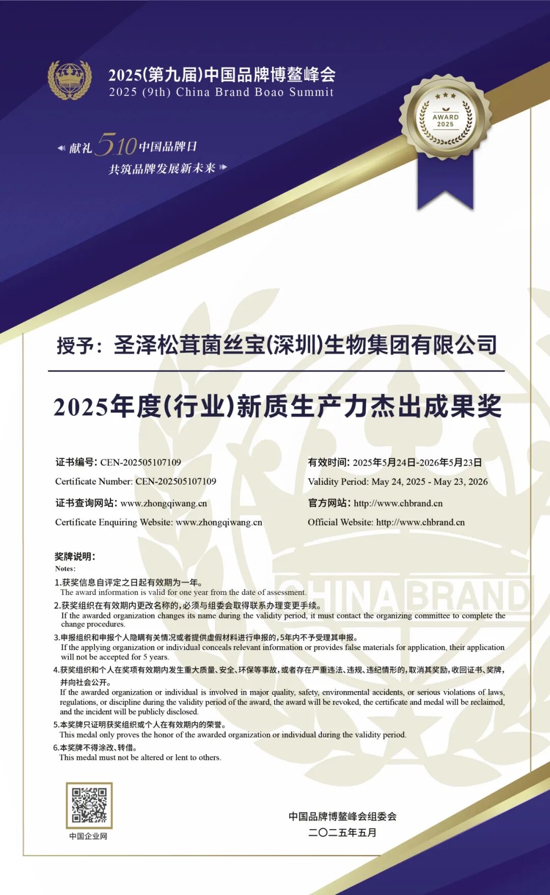 在这场汇聚行业精英的盛会上,圣泽松生物集团(以下称圣泽松)以全球人工培育松茸领域开拓者的身份惊艳亮相,凭借技术、品质和品牌实力等多方面综合优势,从众多优秀品牌中脱颖而出,一举揽获“2025年度(行业)新质生产力杰出成果奖”、“2025年度(行业)匠心品牌”和“2025 年度(行业)药食同源技术创新奖”三大奖项,奖杯的熠熠光辉,映照出圣泽松深耕生物科技领域的卓越成就,更折射出其二十余载砥砺前行的深厚积淀。