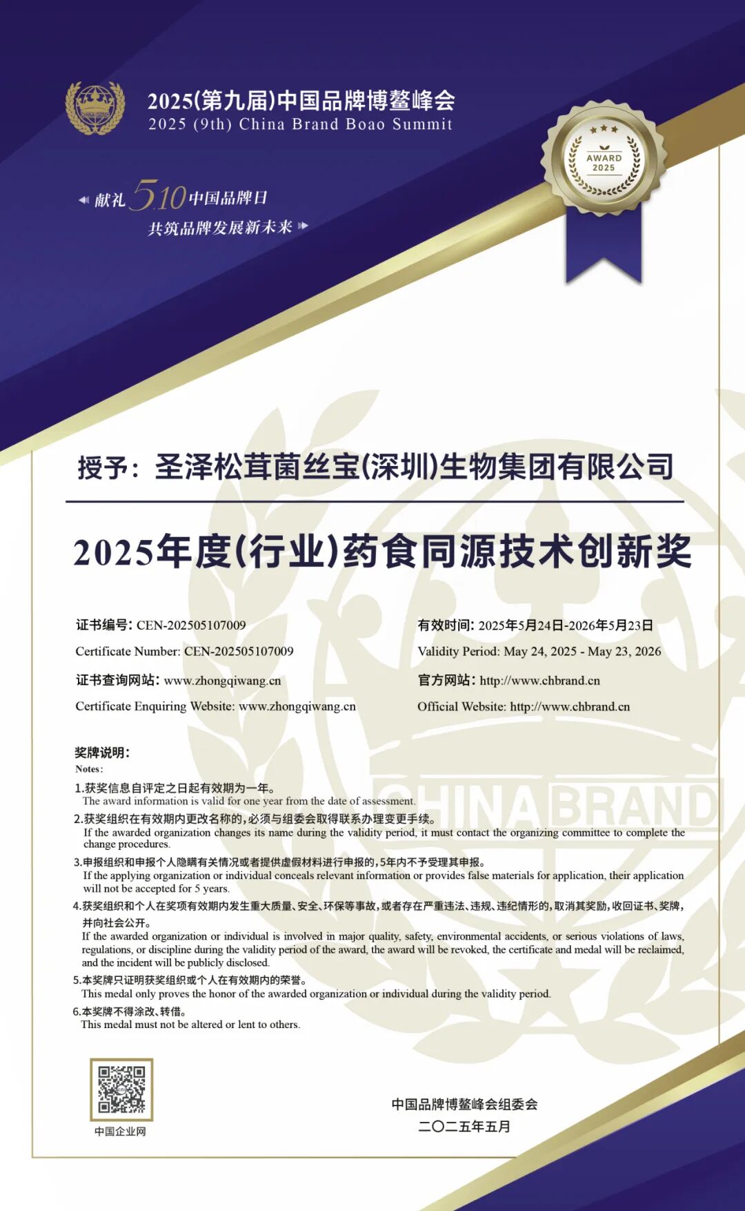 而在药食同源领域,圣泽松化身传统智慧与现代科技的桥梁,从中医药千年智慧宝库中汲取灵感,融合现代科技,深度挖掘松茸的食药价值。通过创新工艺,将古老的养生理念转化为契合现代生活节奏的优质产品,实现传统与现代的完美交融,最终摘得#药食同源技术创新奖的桂冠。