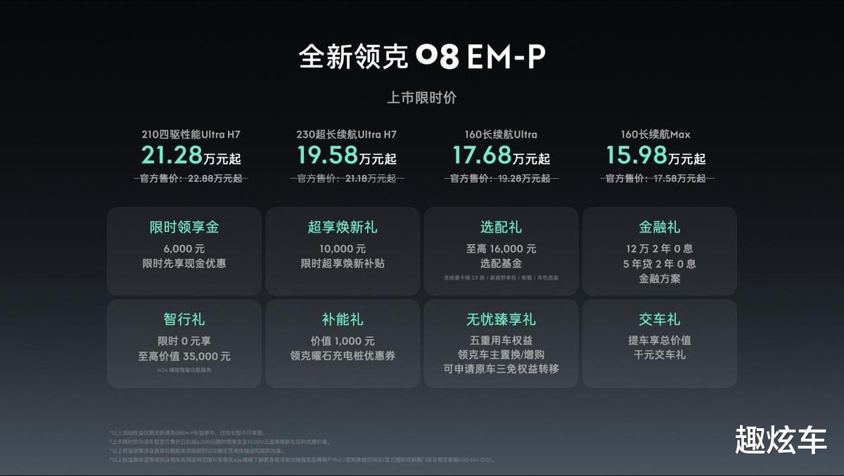 【2025年9月24日 上海】今日,“家庭豪华智混SUV”全新领克08 EM-P正式上市。新车提供160长续航Max、160长续航Ultra、230超长续航Ultra H7、210四驱性能Ultra H7四款车型可选,官方限时价15.98万元-21.28万元。同时,伴随新车上市还有限时领享金、超享焕新礼、选配礼、金融礼、智行礼、补能礼、无忧臻享礼、交车礼在内的8重限时福利。