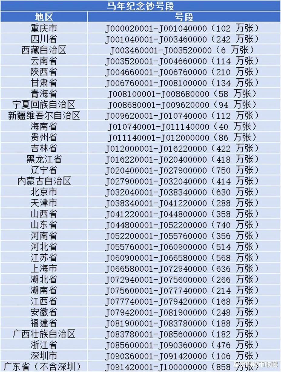 这两天市场上也传出了2026年马年纪念钞各地区号段情况,据说这个号段还是比较准确,不过这个也是目前市场上的猜测,具体还是要等到2026年马年纪念钞兑换以后,才会明确到各地的具体号段是多少。