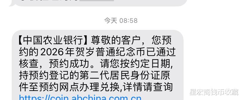 2026年马年普通纪念币和纪念钞目前已经到核查期,核查期时间为2026年1月17日到2026年1月19日。我相信这两天陆续也有收藏爱好者都收到了核查通过的短信,包括我成功预约的一卷2026年马年普通纪念币核查也通过了,通过以后就可以在兑换期内任意一天兑换2026年马年普通纪念币或者纪念钞。