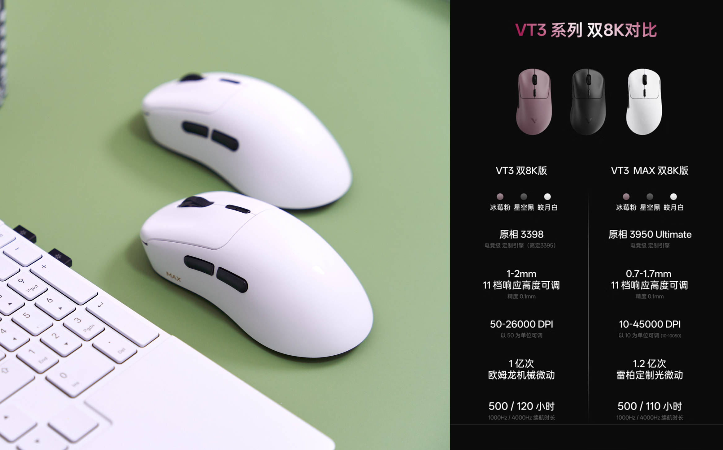 选购建议:VT3(199元档):适合预算有限但追求高性能的玩家。3398传感器+原生双8K已超越同价位竞品,尤其推荐学生党和入门电竞选手。VT3 Max:原相3950 Ultimate+狂暴竞技模式,性能比肩千元旗舰。职业玩家或追求极致参数者闭眼入。