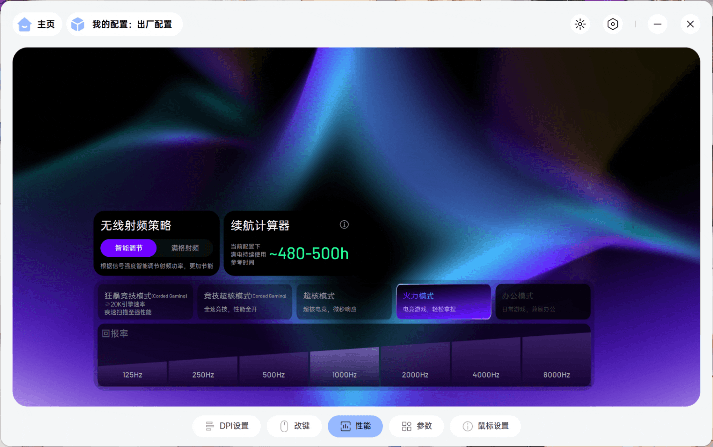 在性能调节页面,多种性能模式也供玩家自行在不同的场景下选择切换,还有专门的UI适配,根据性能发挥激进程度还能推算电池续航时间,玩家需要的都被照顾到。MAX版的狂暴竞技模式拥有≥20000FPS静态疾速扫描满帧率,只有搭载全球首发的NORDIC 54芯片才是最佳选择!将3950的性能直接榨干,高帧率下同时拥有持久的续航。