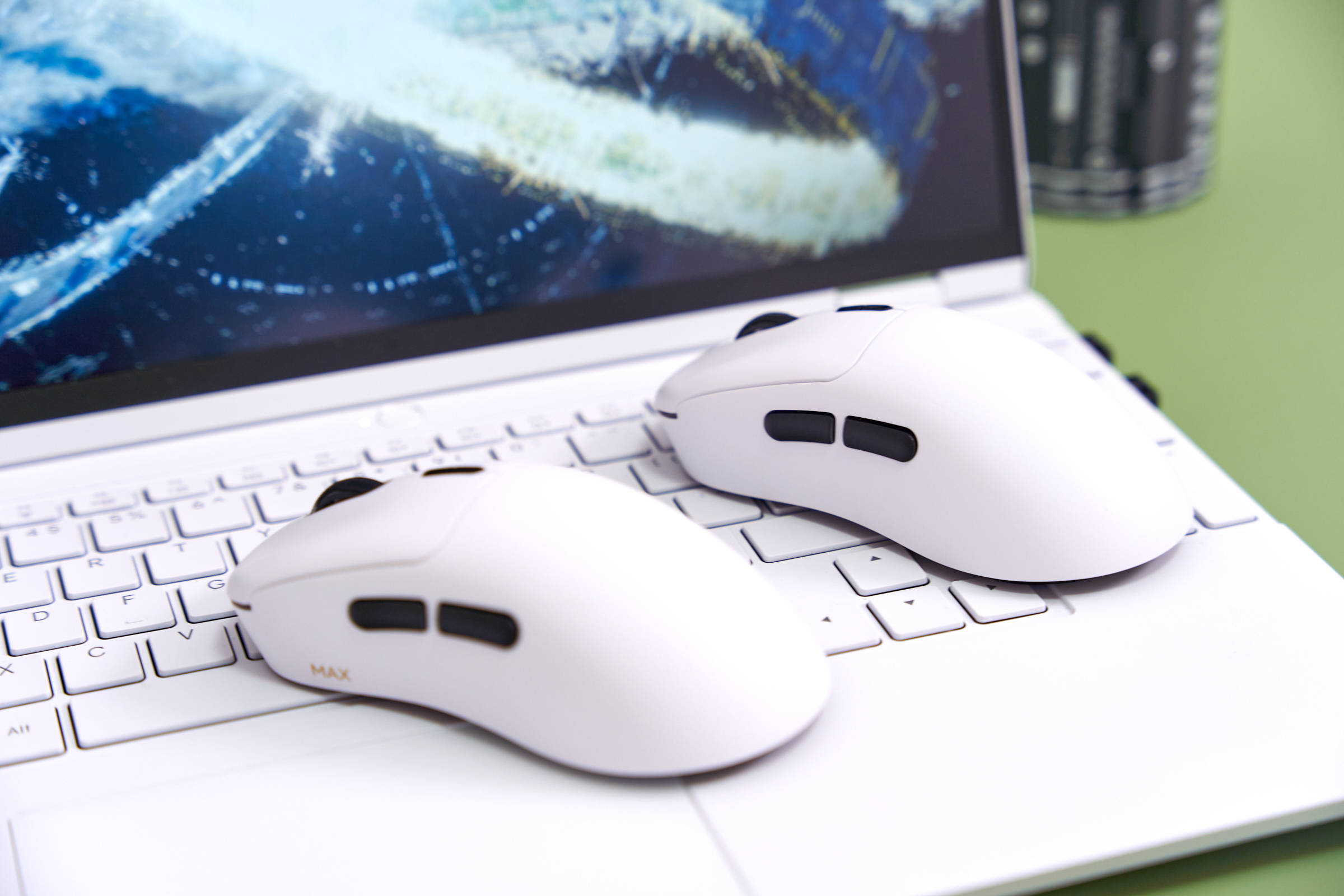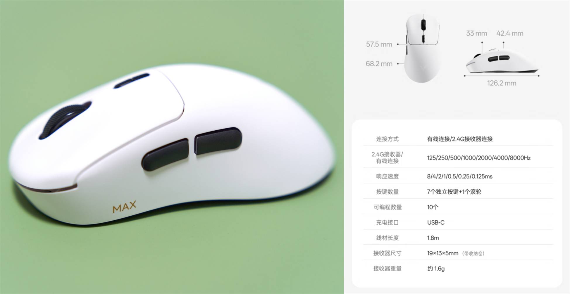 都是非对称右手工学设计,参数也一致。长126.2mm、高42.4mm,腰部横握点处57.5mm、尾部最宽处68.2mm,专为中大手型优化。VT3 Max在拇指位前端有个“MAX”暗金标志,是与VT3外观上的唯一区别。