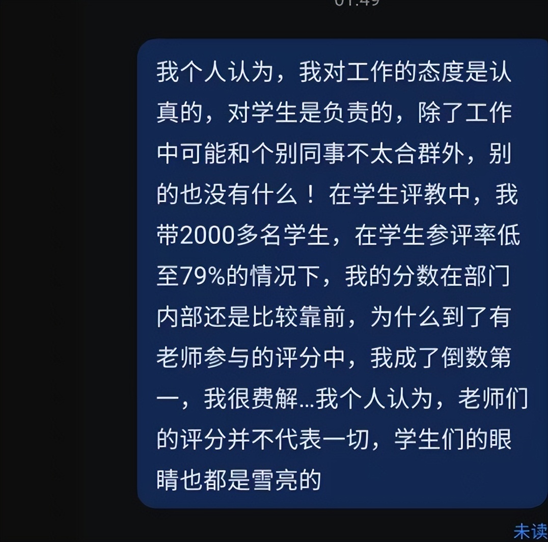 这个老师在自己的社交平台上发内容显示,该老师是一名思政老师,在考核评测中,在学生的口中她的反馈是比较好的,而且评分靠前,但是只要到了有老师参与的环节,则此次倒数第一。这显然很不合常理,所以她认为自己受到了其他老师的排挤和不公的待遇。