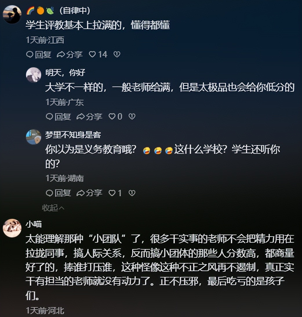 有网友说:太能理解那种“小团队”了,很多干实事的老师不会把精力用在拉拢同事,搞人际关系,反而搞小团体的那些人分数高,都商量好了的,捧谁打压谁,这种怪像这种不正之风再不遏制,真正实干有担当的老师就没有动力了。正不压邪,最后吃亏的是孩子们。