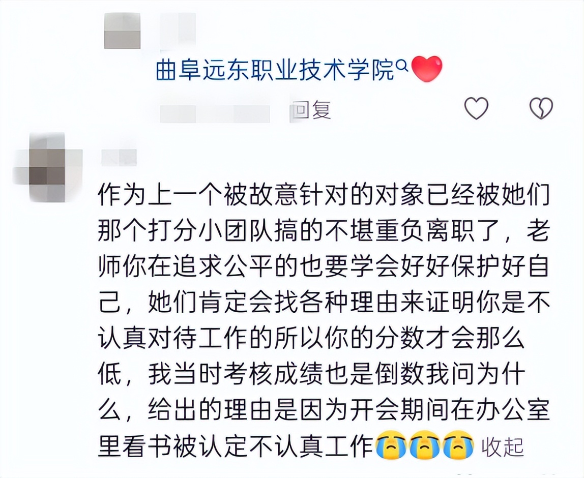 在该老师的帖子下,有疑似前同事留言称:作为上一个被故意针对的对象已经被她们那个打分小团队搞的不堪重负离职了,老师你在追求公平的也要学会好好保护好自己,她们肯定会找各种理由来证明你是不认真对待工作的所以你的分数才会那么低,我当时考核成绩也是倒数我问为什么,给出的理由是因为开会期间在办公室里看书被认定不认真工作!