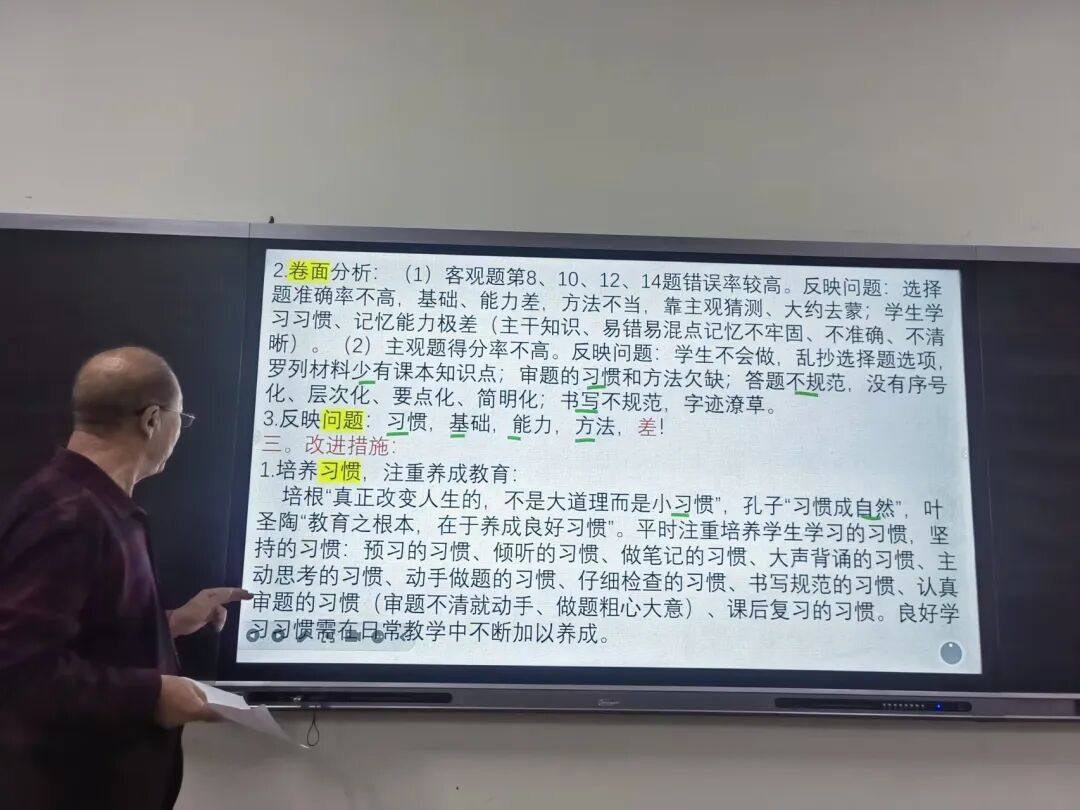 政治郑老师指出,本次考试集中反映了学生在“习惯、基础、能力、方法”四大方面的短板。郑老师的分析一针见血,深刻剖析了本次月考暴露出的问题,并提出了明确的改进方向。强调“教育之根本,在于养成良好习惯”,并提出了系统性的改进措施,核心在于日常教学中持续培养学生的九大学习习惯。