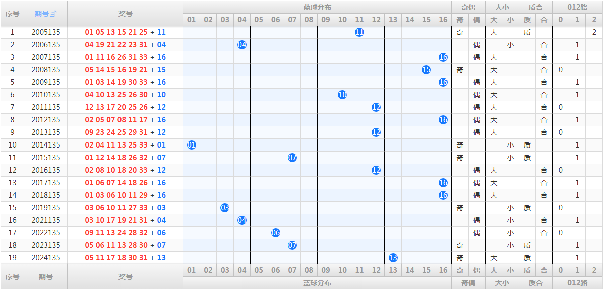七、历史同期,蓝球开奖号码和走势图(历史数据演示):