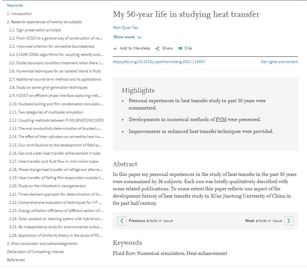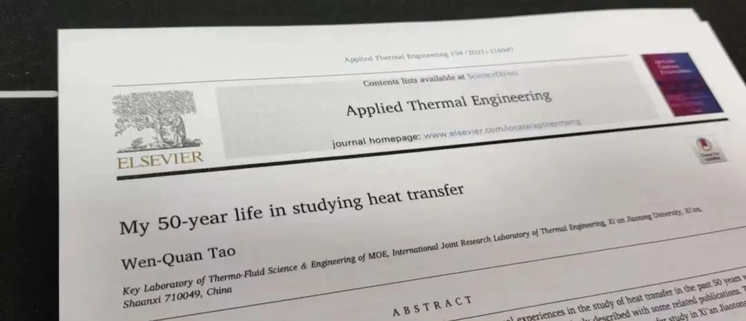 这篇论文题目为 《My 50-year life in studying heat transfer》( 我与传热学的50年 ) ,发表在《Applied Thermal Engineering》期刊上。文章 简述了陶文铨院士在1983年后的主要研究工作,相关工作分为26个题目。