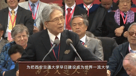 “ 我要和全体师生员工及交大校友一起,努力发扬具有交大特色的“奉献报国的使命文化、严谨精致的卓越文化、开拓进取的创新文化、团结互助的团队文化”,为把西安交大早日建设成为中国特色世界一流大学而努力奋斗! ”