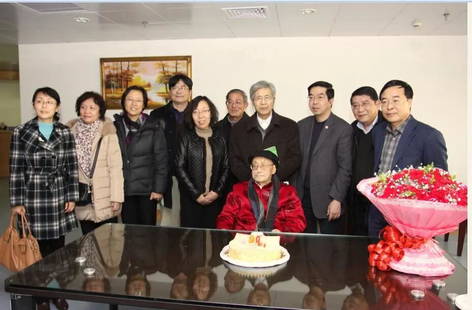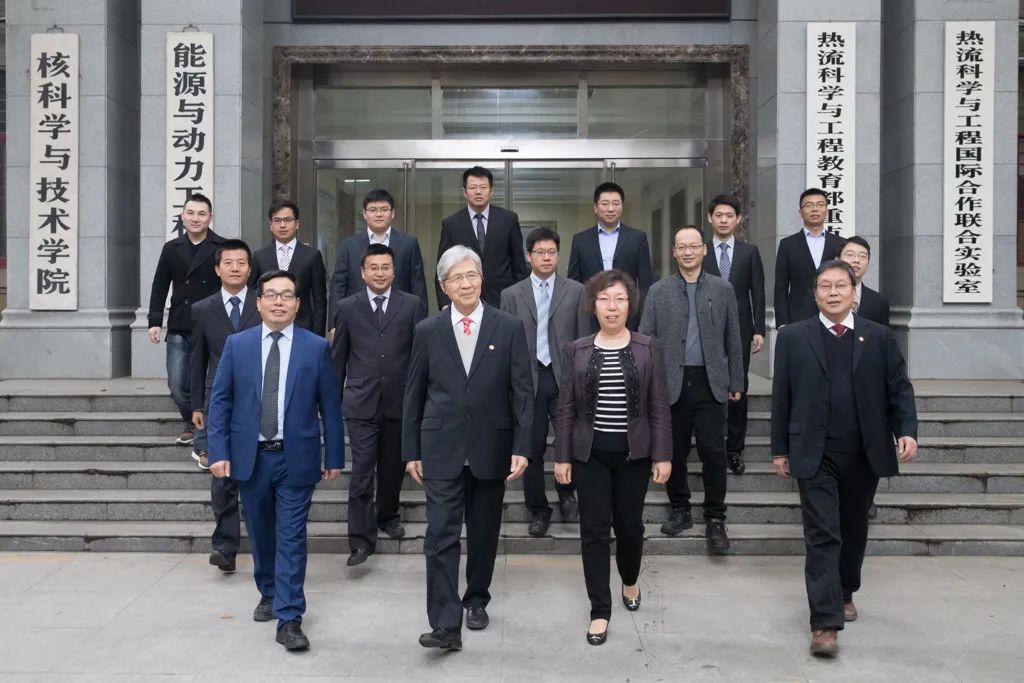 △陶文铨院士(后排右四)、何雅玲院士(后排左五)及上海交大部分教授与杨世铭先生(前排中)合影。