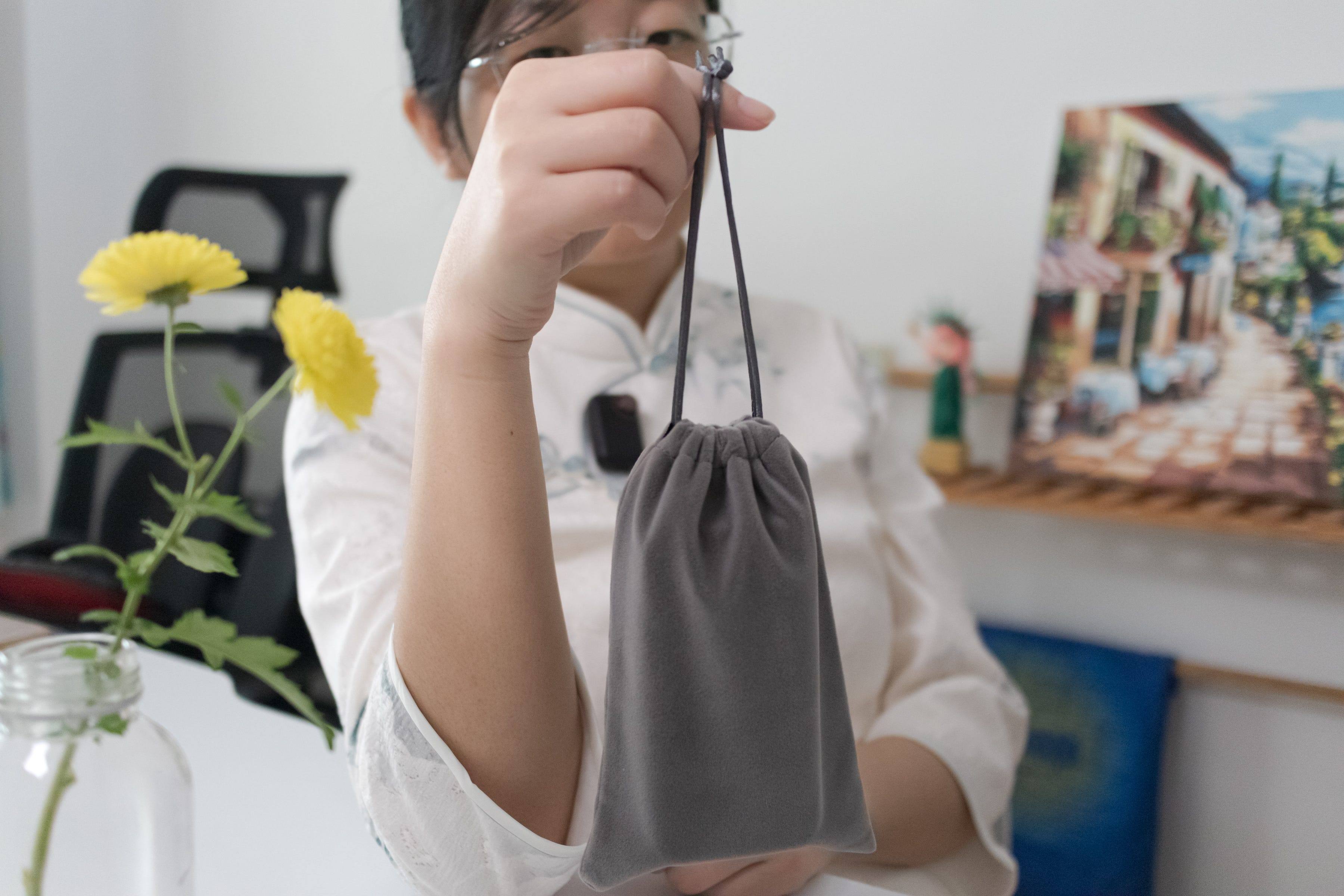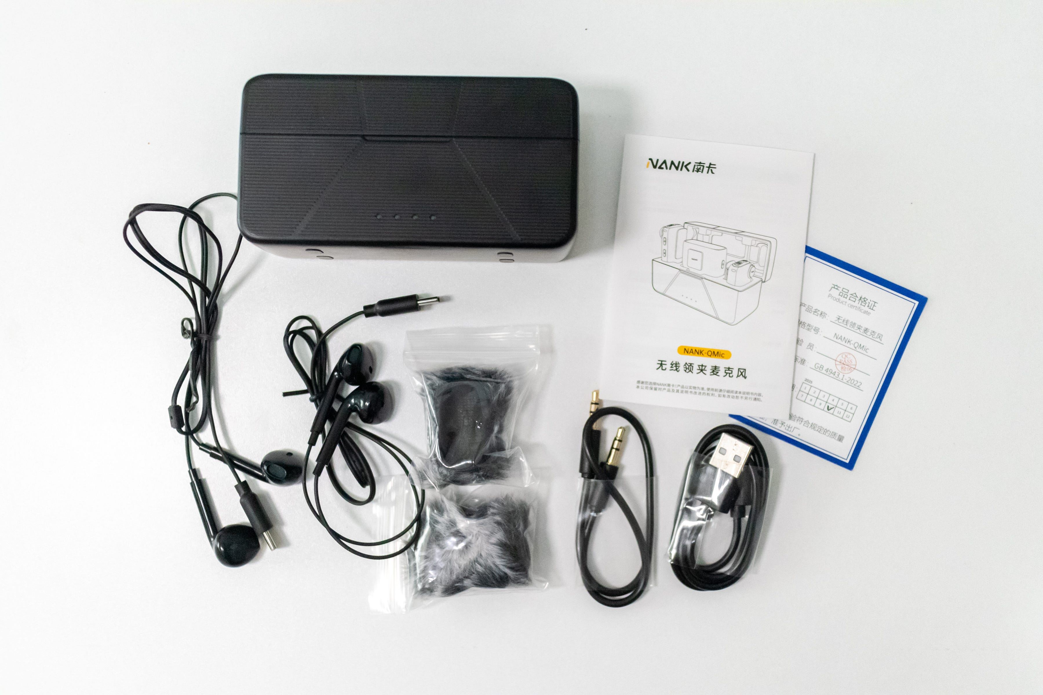打开包装盒,内部配件摆放得整整齐齐,仪式感拉满。清单包括:一个黑色充电盒、说明书、合格证、两副Type-C监听耳机、一根3.5mm双头音频线、Lightning/Type-C双转接头、一对毛茸茸的防风毛套,甚至还有一个贴心的收纳袋——柔软耐磨,能把所有配件妥善收纳,这一点很多同类产品都做不到。